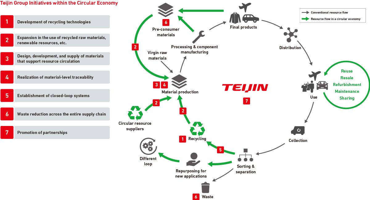 The Teijin Group is promoting initiatives for the achievement of a circular economy. The achievement of a circular economy requires using resources efficiently for as long as possible. By maintaining the value of resources and utilizing them effectively, it is necessary to reduce environmental impact and minimize waste and the release of hazardous substances throughout the entire life cycle of products and services. Working with a broad network of partners, the Teijin Group promotes initiatives such as the seven listed below across different stages of the value chain.