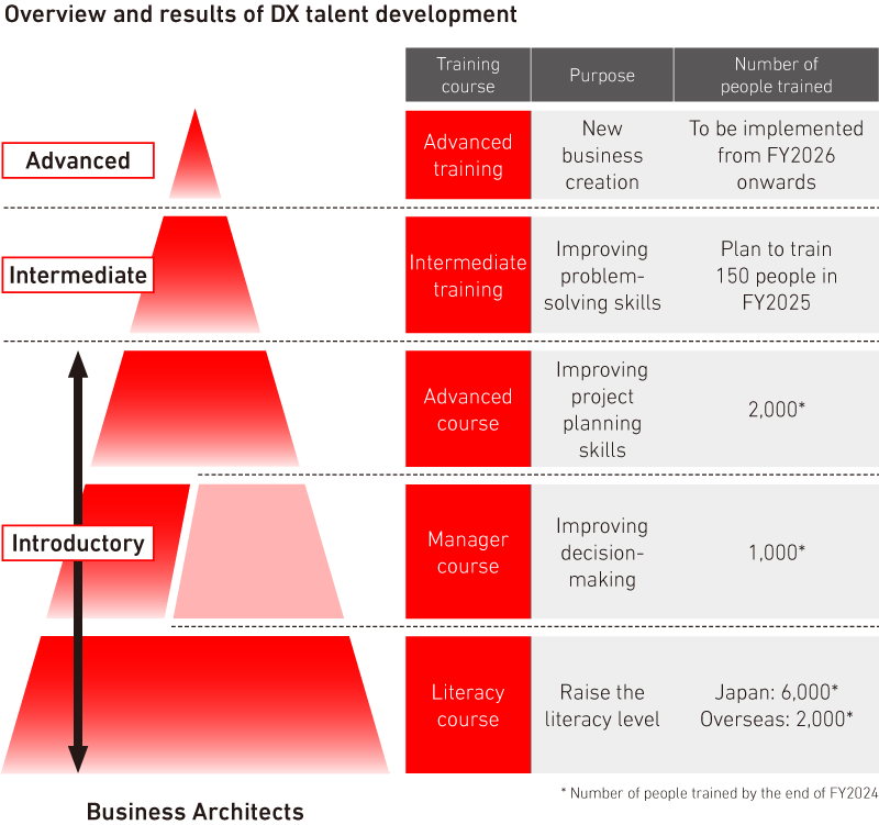 We have been committed to providing introductory DX education since FY2023, offering a digital literacy course to raise the digital literacy level of our global employees. We also offer a manager course aimed at managers to develop decision-making skills, and an advanced course aimed at top-performing students from the literacy course to develop planning skills for DX projects. In FY2025, we will start a program to train "business architects," which offers intermediate training for employees selected from each business unit, aimed at developing their ability to solve business challenges using digital technology.