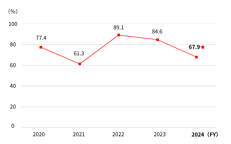 In FY2024, we placed particular emphasis on strengthening core positions. For executive positions, each executive prepares a succession plan that is then updated through a three-way meeting with the CEO and CHRO. Discussions are also held on the possibility of external recruitment and the strategic placement of internal successors, and efforts are being made to accelerate the development of candidates up to the time of appointment. As for the required number of successor candidates, which is set at five to seven per core position, the coverage ratio (successor coverage ratio*) improved from 74% in FY2023 to 84% in FY2024.